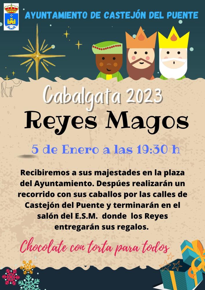 El 5 de enero de 2023 a las 19:30 horas recibiremos a sus majestades los Reyes Magos de Oriente en la plaza del Ayuntamiento. Después los Reyes reaizarán un recorrido por las calles de Castejón del Puente que finalizará en el salón del Edificio de Servicios Múltiples.